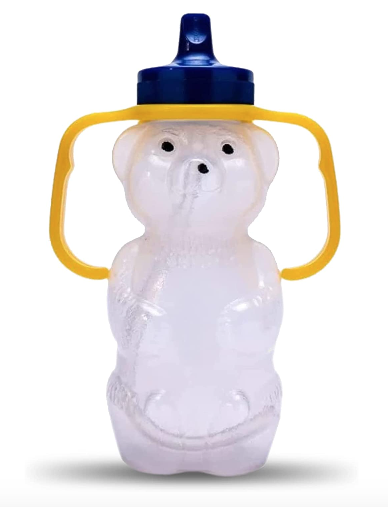 If your little drinks from a bottle, introduce a honey bear at 9-10 months using our parallel straw hack to get your little ready to wean from the bottle by 12 months!